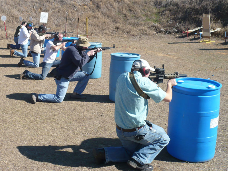 The intent of the course is to lay the foundation for the use of a long gun in a defensive manner. While many such courses are about “defensive shotgunning” or “defensive carbine”, this course is unique in that it’s about the use of any long gun: rifle, shotgun, or pistol caliber carbine. The basic principles are the same regardless of the particular firearm: presentation, rapid acquisition of sight picture (cleardistinctfrontsightpost-press-cleardistinctfrontsightpost), shooting from standing, shooting from kneeling, shooting around barriers, shooting distances of 3-25 yards, cover, movement. Another nice thing about having any sort of long gun in the class is that you get to see the effects of other long guns. For instance, shotguns are wicked things but as the distance to the target increases it becomes difficult to control where every pellet lands (e.g. at 25 yards, maybe you’ll need to use a slug). Or as well, using an AR, where the sights are very high above the bore, when shooting at close ranges you really have to compensate with holdover. The class gives you an opportunity to not only pick up skills with your choice of long gun, but it also gives you a chance to see how other long guns fare in the same contexts, learn the strengths and weaknesses of each. The class does teach some specifics about particular long guns (e.g. good techniques for shotgun reloading), but for the most part you realize that the principles are the same.