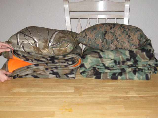 Originally we wanted to sew a fleece “blaze orange” on the other side of both blankets. Unfortunately with the bolts of orange fleece they had, only one gave us enough to do what we wanted (I wanted 2 yards, the other bolt only had 2 1.5 yard pieces). So we grabbed some of that black fuzzy fleece. Thus one blanket has camo on one side and hunter blaze orange on the other, and the other blanket is camo and the fuzzy fleece.