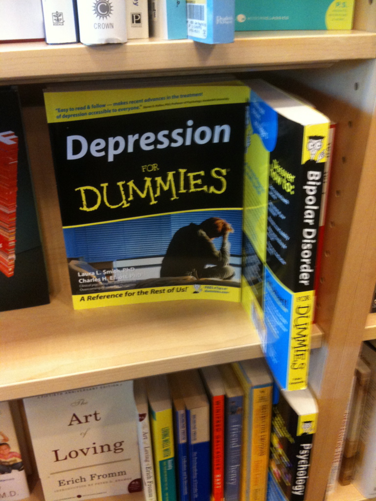 Seen at the local bookstore 2010-10-142010-10-13 / hsoi Went to the bookstore to look for a book (what else?). While walking the aisles I saw this: 😯 Alright! Way to help the cause. It’s not like depressed people are sensitive and low on self-esteem. 😉 Share this: Click to share on Facebook (Opens in new window) Facebook Click to share on X (Opens in new window) X Click to share on Reddit (Opens in new window) Reddit Click to share on LinkedIn (Opens in new window) LinkedIn Click to email a link to a friend (Opens in new window) Email Like Loading... Related