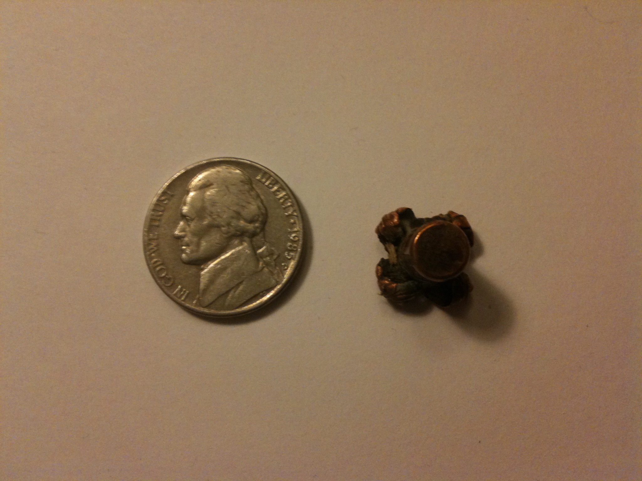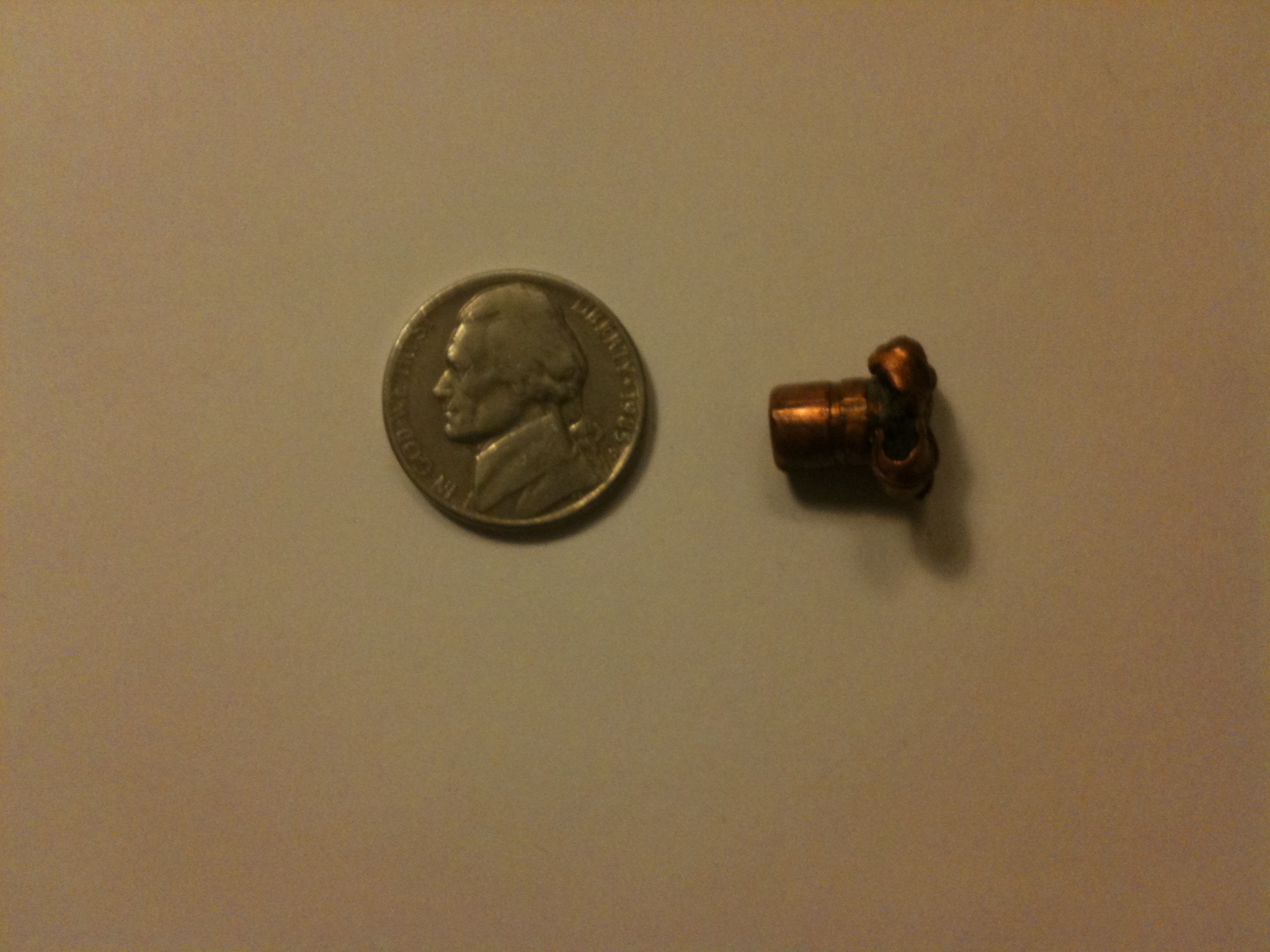 I weighed the bullet on my beam scale. The bullet is about 85.0 grains, +/- 0.1 grain. I tried weighing it at 84.9 and 85.1 and both were not centered. 85.0 wasn’t precisely centered either but was the closest. So assuming about 85.0 grains from a fresh bullet hey… looks like we’ve got essentially 100% weight retention in addition to perfect expansion.