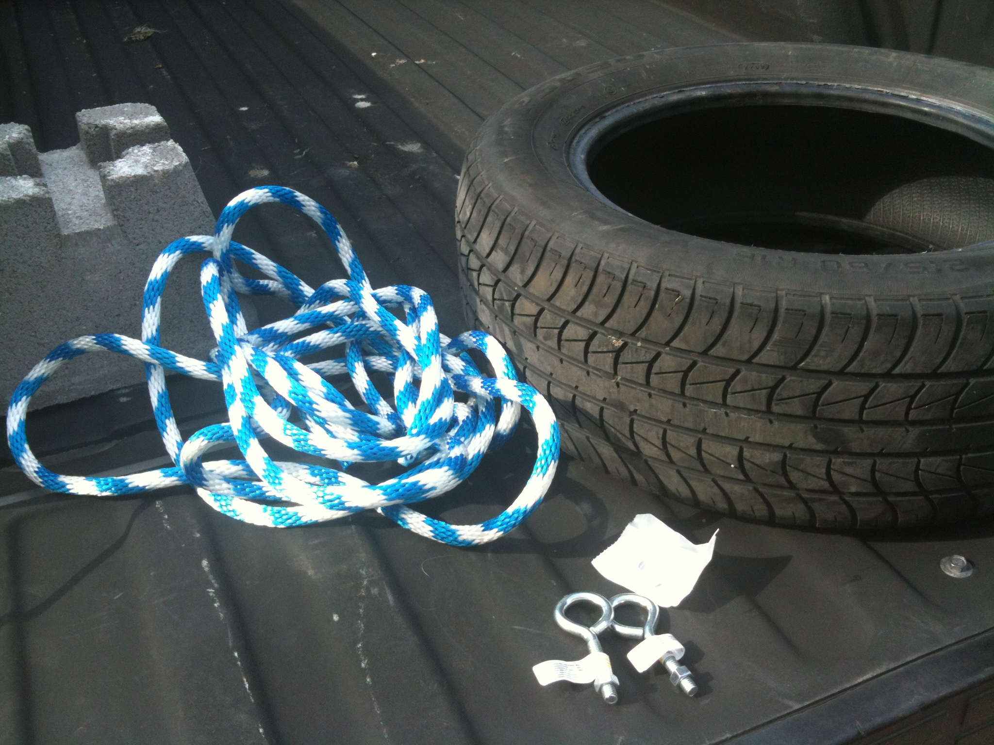 I took the rope and cut it in half. I tied large loops in one end using a double bowline knot. These will be the handles. I wanted thick rope to make it easier to grab, and large loops so it doesn’t compress my hands too much when pulling. The double bowline should remain secure. I must admit this is NOT the material I wanted to use… the rope doesn’t hold the knot very well, and I probably should have gotten 30′ instead of 25′ because I lost a lot more than I anticipated to the knots… it’s just thick and doesn’t hold very well, tho you can pull VERY hard and get the knots to tighten up better. I would have loved chains, but that would be very costly. I did look at tiedown straps, but they all would come with a ratchet and I don’t need it and the price was just getting too costly.