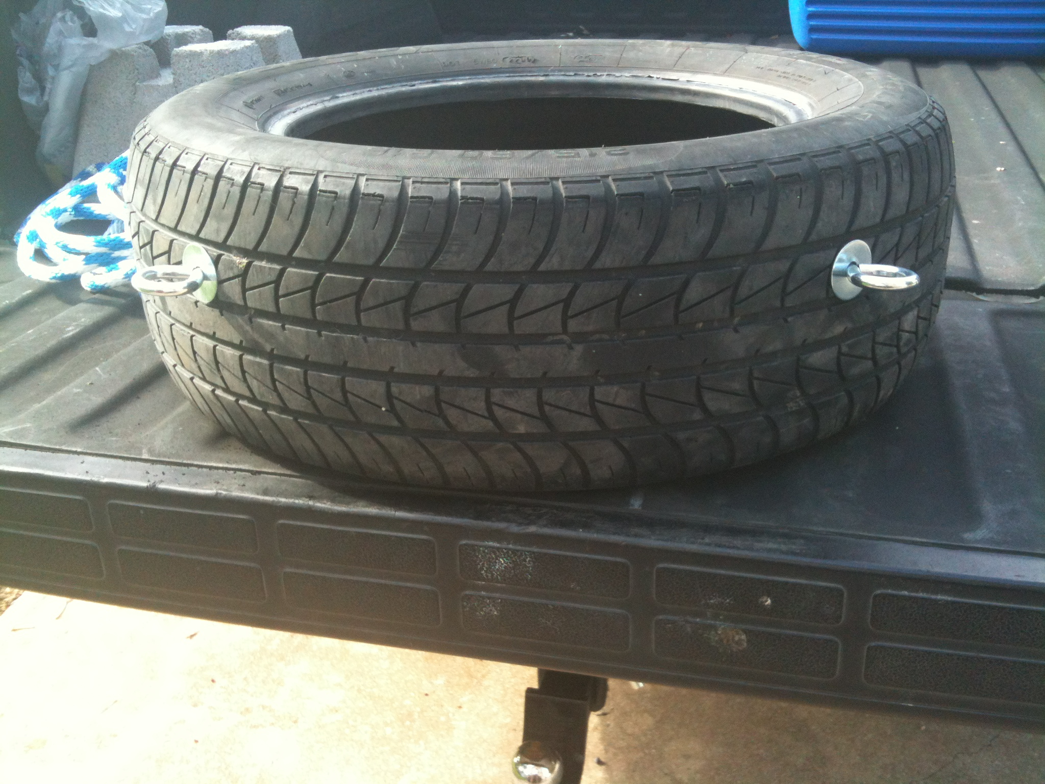 It’s a little tough getting the bolts in there, due to all the steel belting, but just keep working at it. I did opt to put a fender washer on each side, to ensure a good hold, but no need for anything like a lock washer since the tire will give enough and should put ample backpressure on the nut to keep things secure.