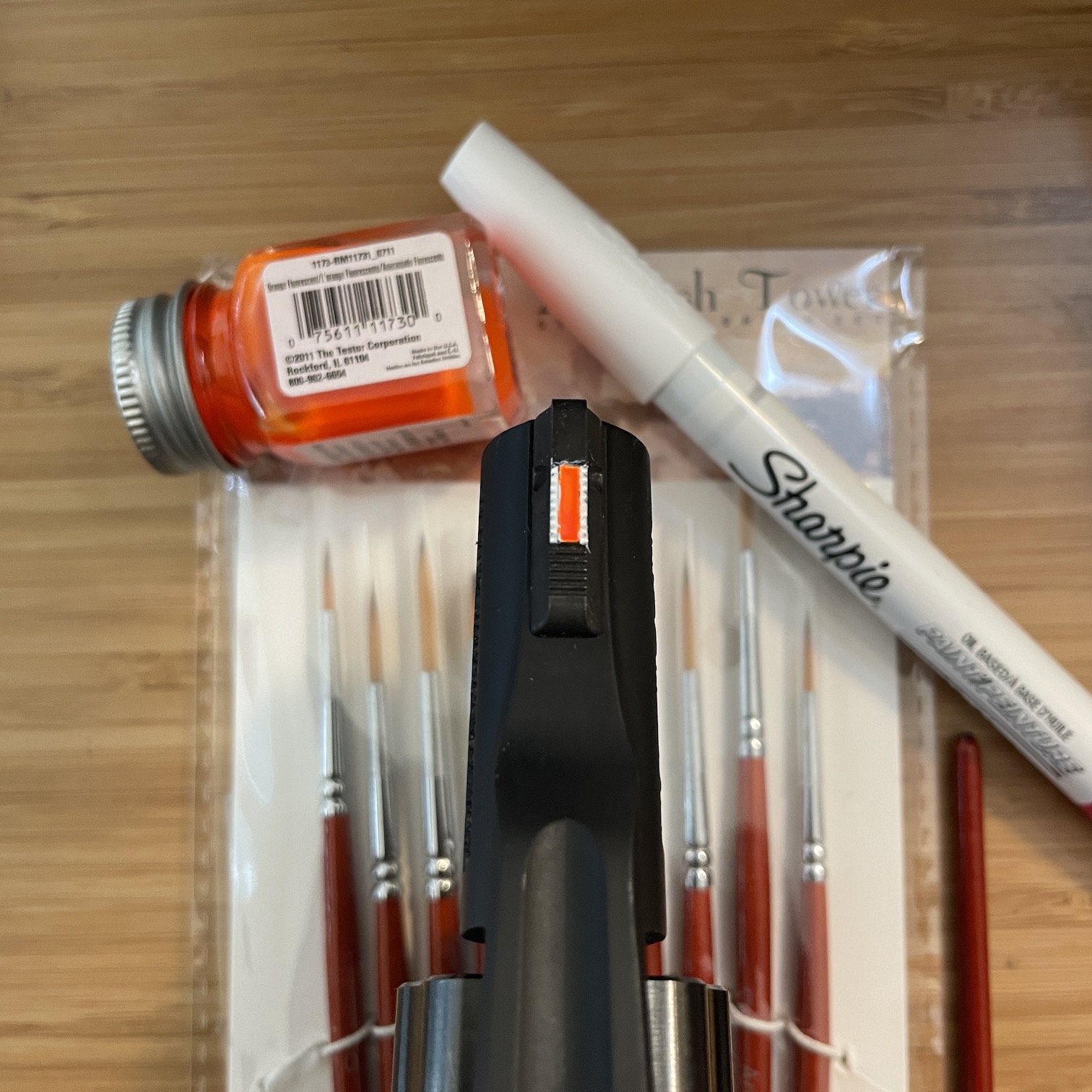 While the white ramp from the factor isn’t a bad front sight, the white isn’t the most contrasting of colors against all backgrounds. Fluorescent orange on the other hand…